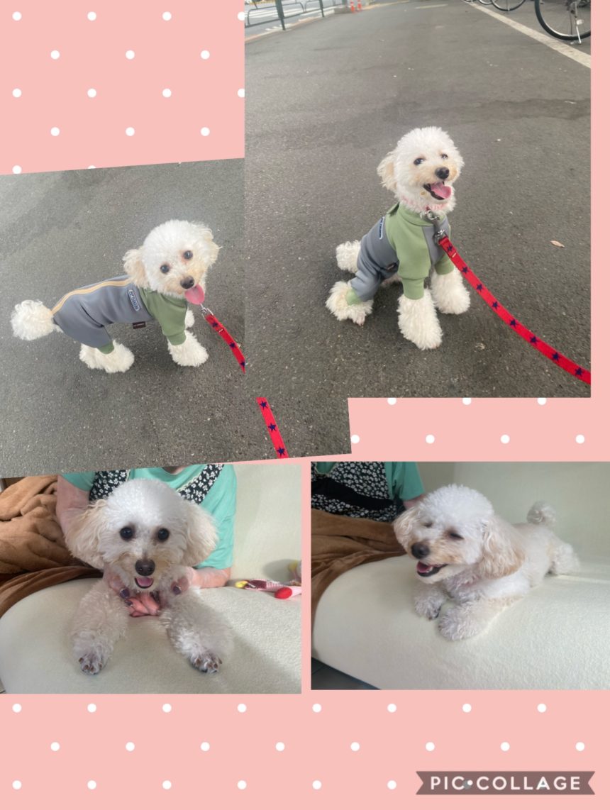 レインウェア着せて、濡れない散歩コースを歩きました。