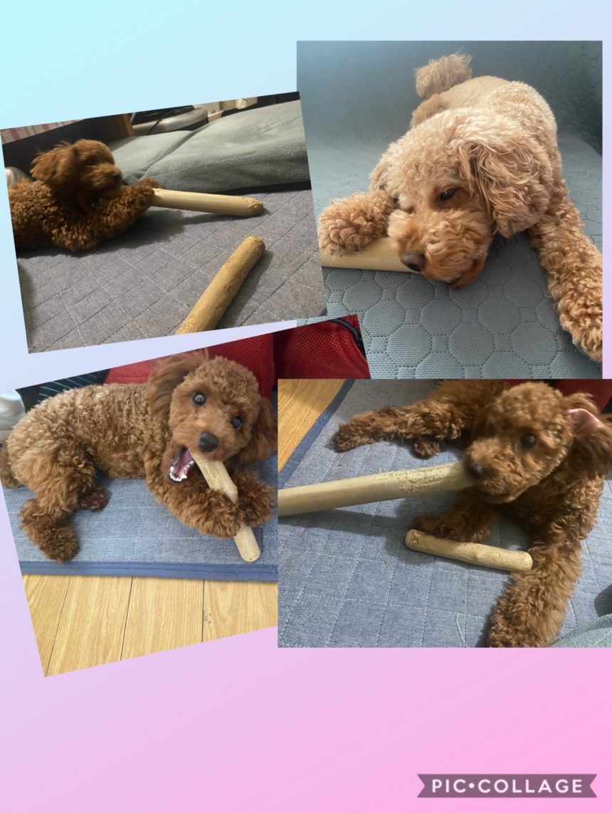 それぞれに渡したのですが、モナカがポノの木の棒も取りにいき、2本独占して交互に噛んでました。
