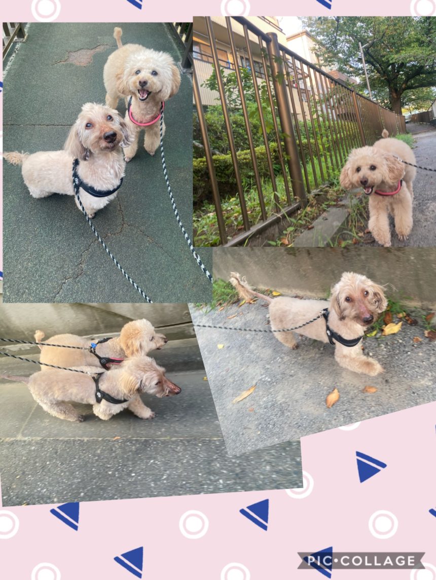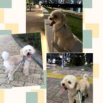 川沿い散歩コース。タップーはいつもアイコンタクト、ミルクは好奇心旺盛で、匂い取りに専念していました。