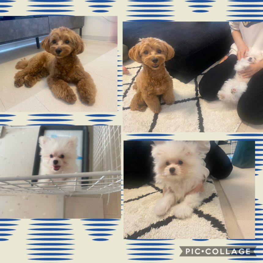 きなこの吠え癖改善と同時に、おもちのパピー基礎トレーニングを担当します。