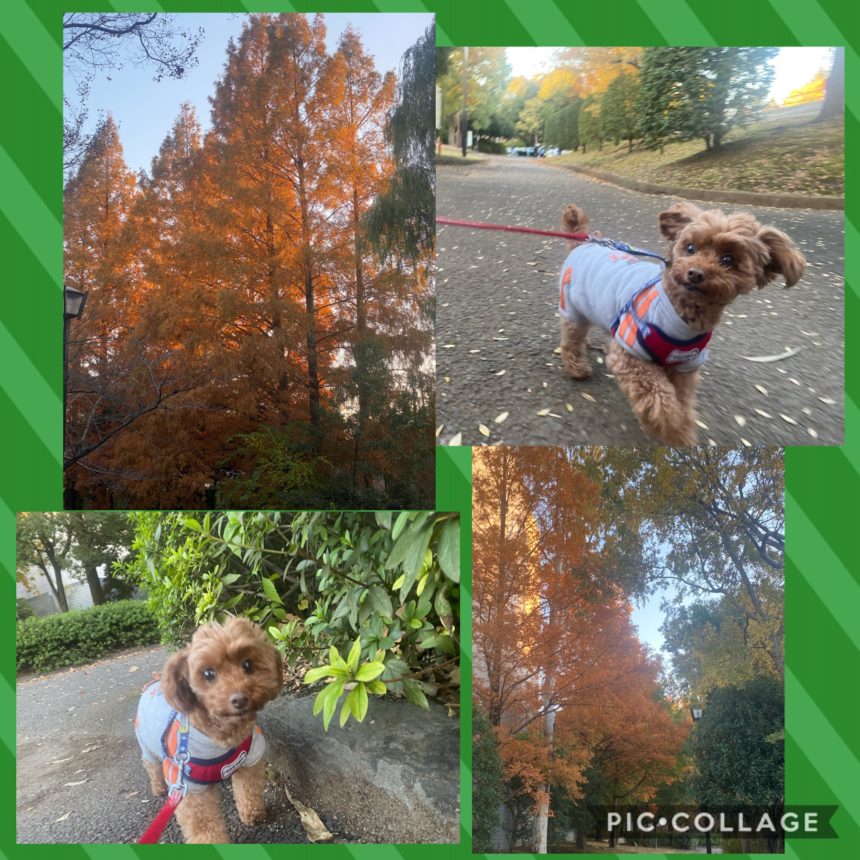 暖かい一日。 モカコは、クン活しながら落ち葉の上を楽しそうにザクザク歩きます。
