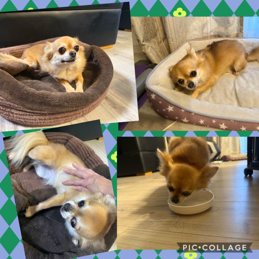 夕方も、尻尾フリフリ大歓迎、大好きなベッドでお腹見せて甘えてくれます。