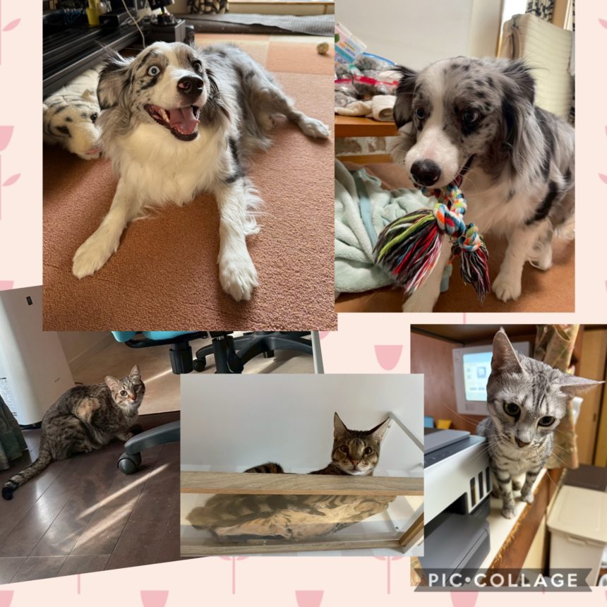 エルモと猫3匹(りん、レオ、るいじ)の初シッティングをスタートしました。