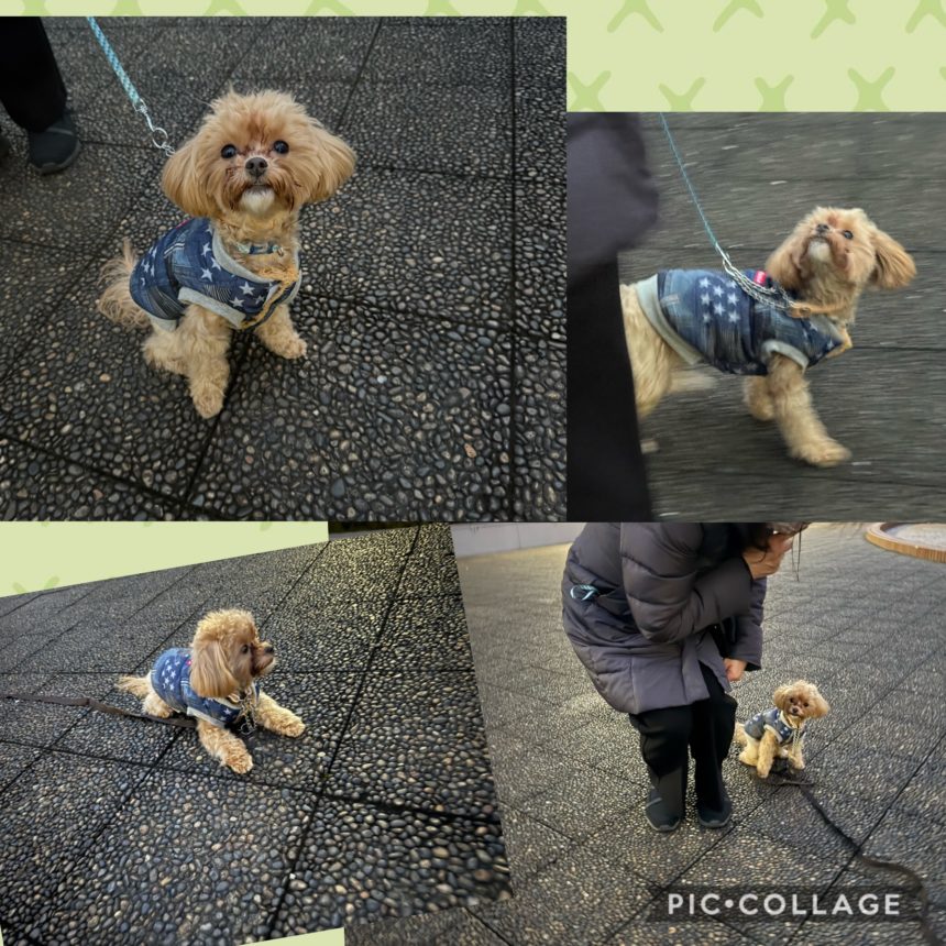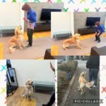 今日は、前回練習した脚側停座を外で、ロングリード使用で距離伸ばして行いました。