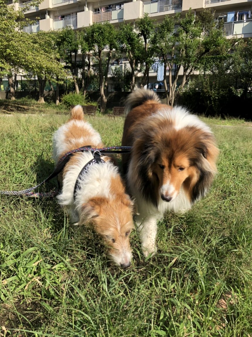 今朝の元太と良太。 爽やかな秋晴れ散歩。