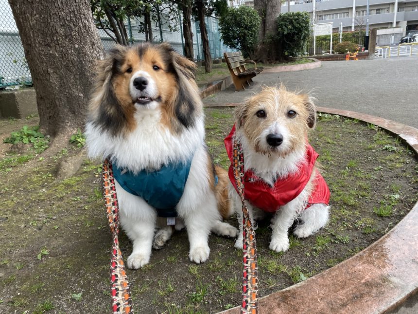 今朝の元太と良太のお散歩時間は、タイミング悪く小雨から本降りへ。