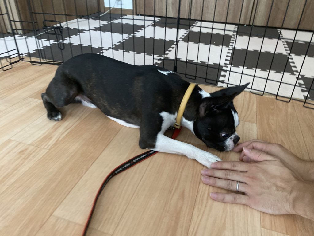 座れや伏せなど、体勢を低く保つ事で飛び付きを改善していきます。
