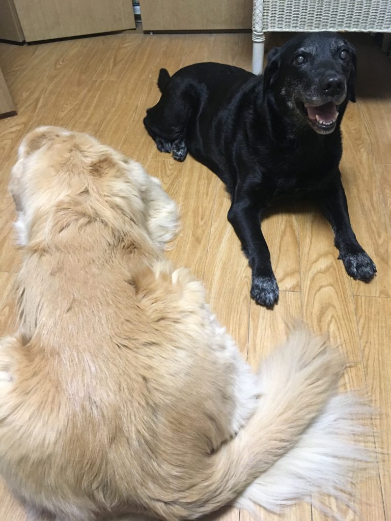 せっかくのジェシカのステイ。 最初から雨です。 室内では、2頭ともに朝から私について回っています。 時々プロレス再開。メイは寝技でジェシカをかわしています。 大型犬同士は迫力あります。